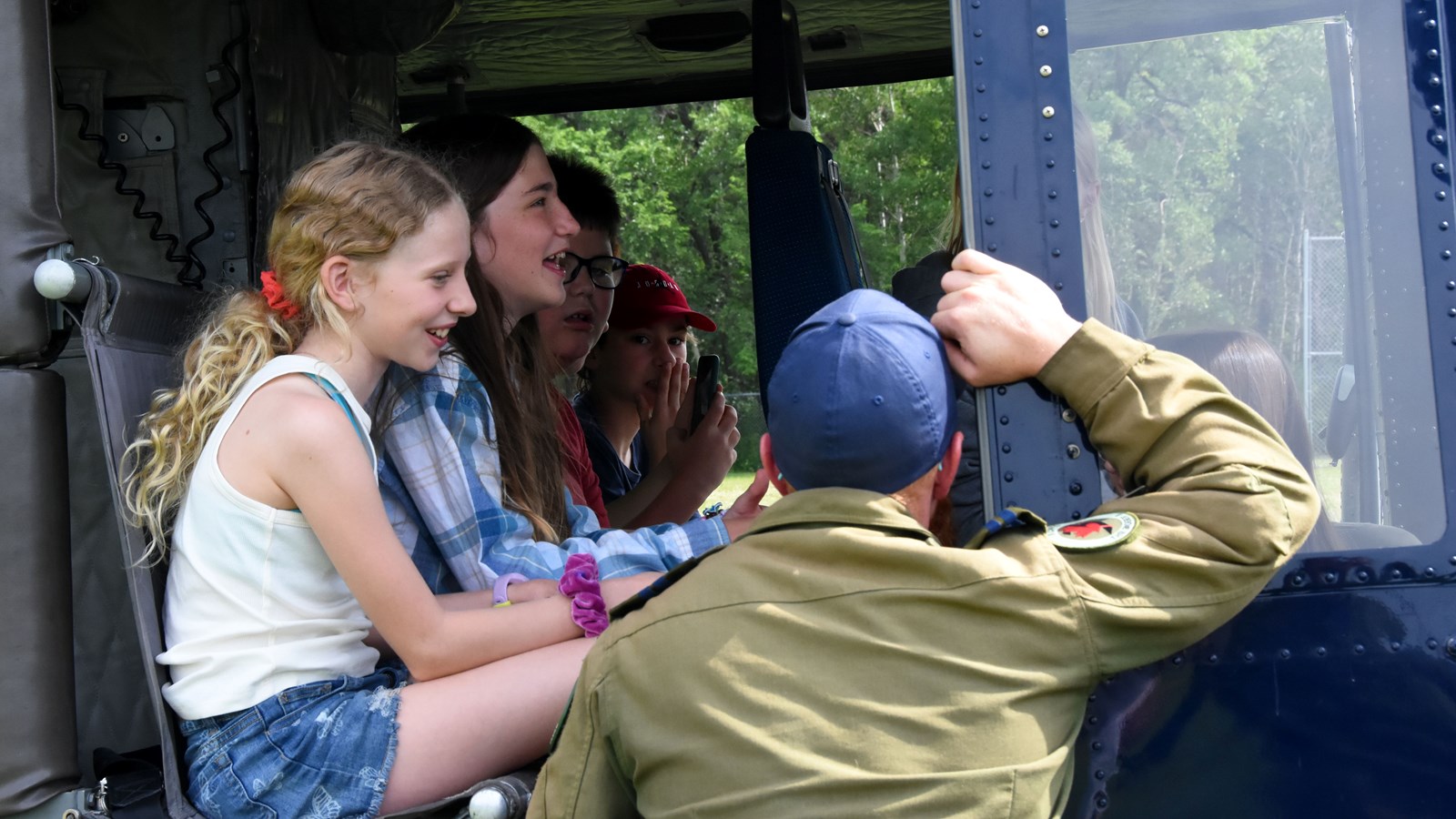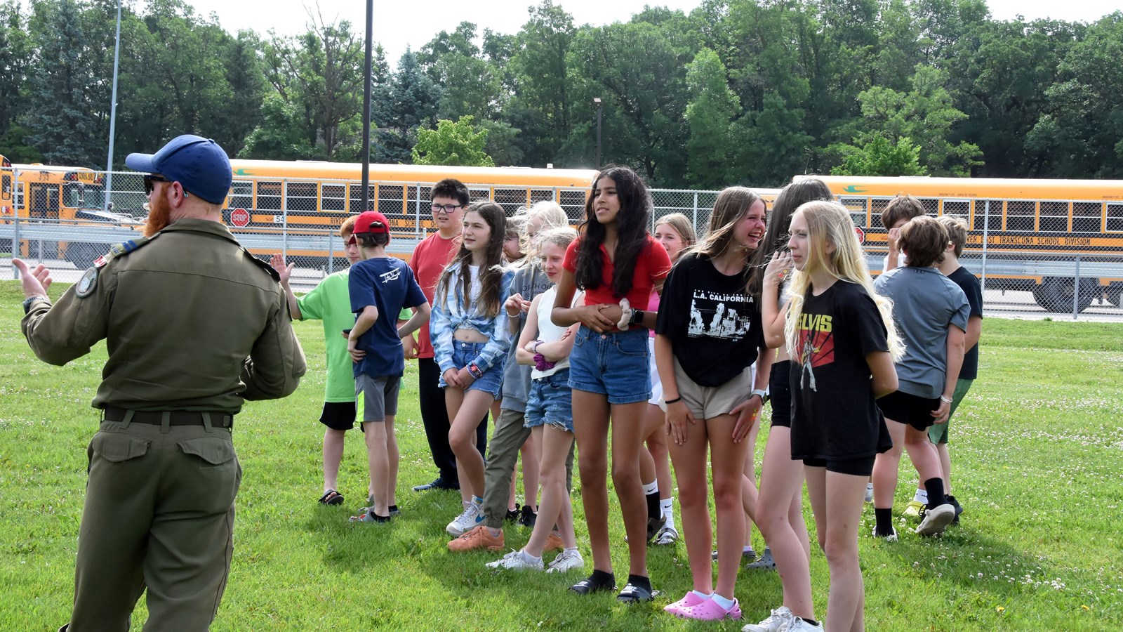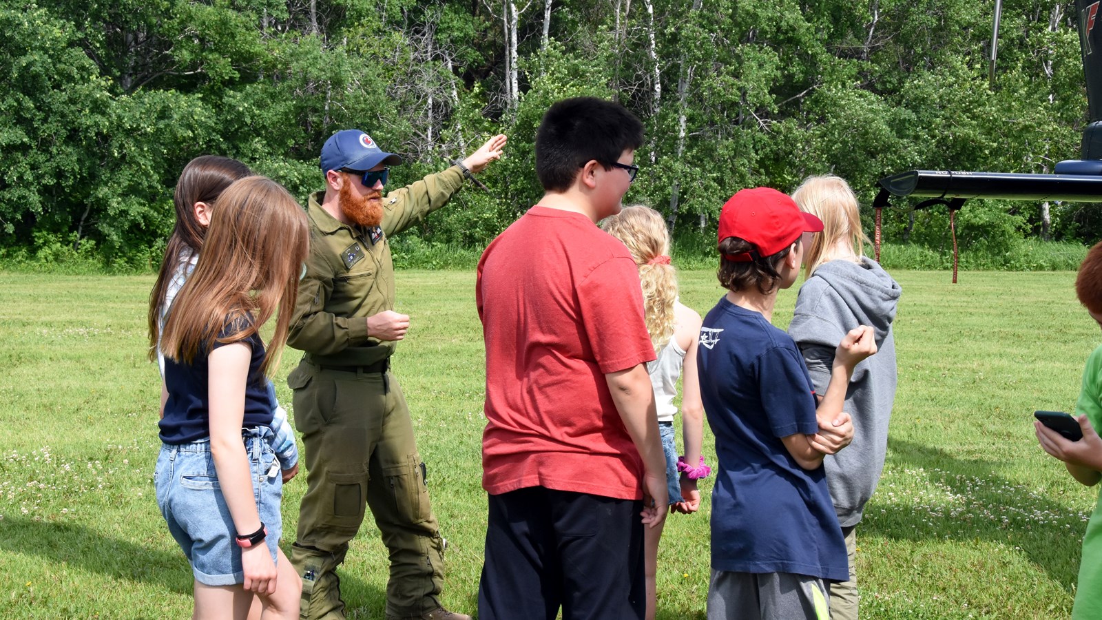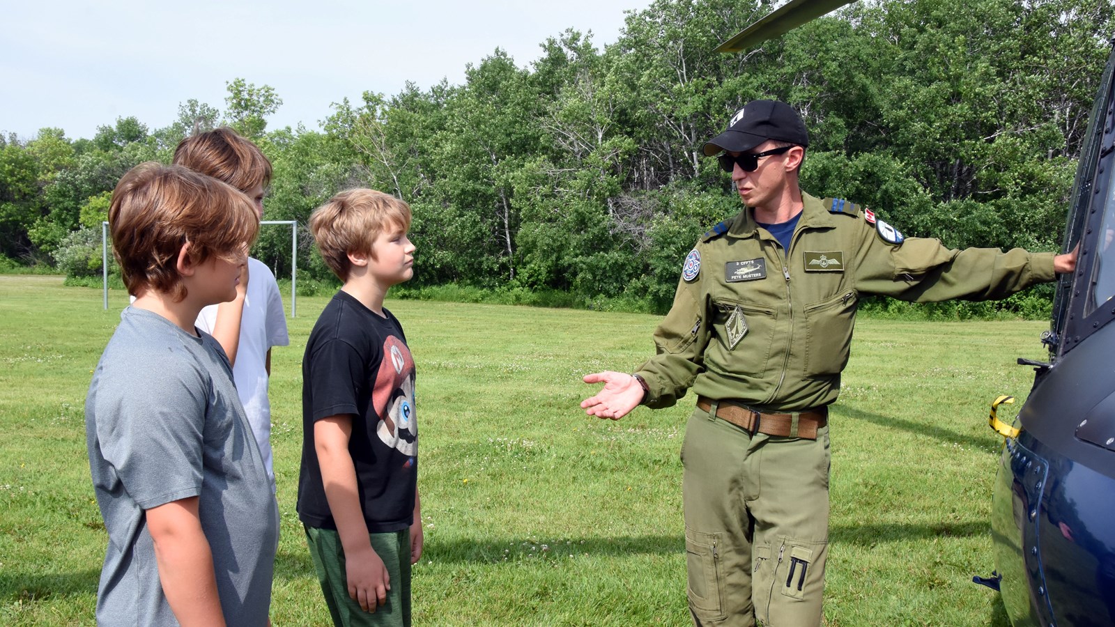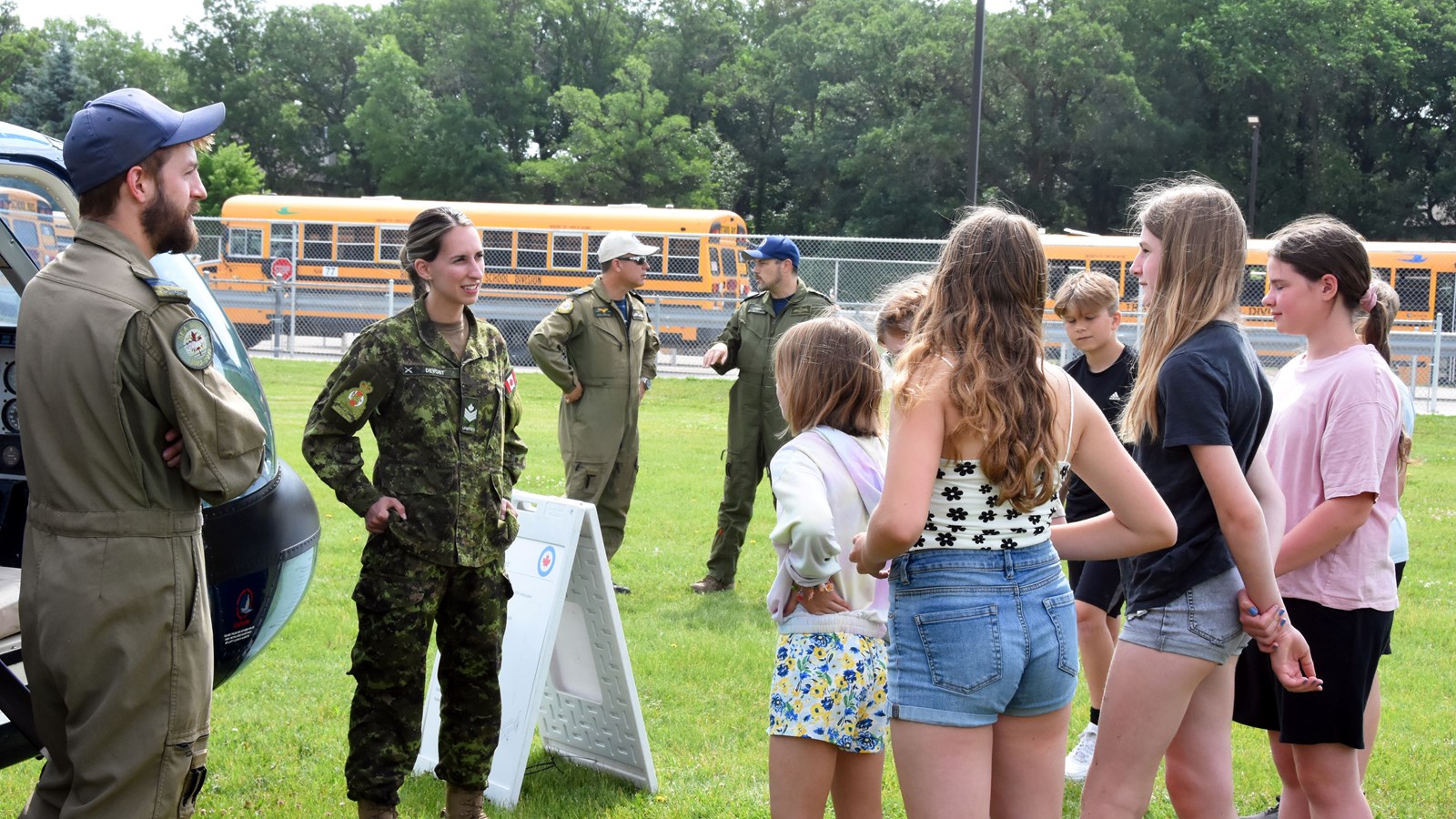The morning of June 19, Grade 6 students from Robert Andrews Middle School gathered behind a fence, excitedly awaiting the appearance of some special visitors from the Canadian Armed Forces. Soon, they heard the rhythm of helicopter blades growing louder and two helicopters hovered, descended, and landed in the field by their school.