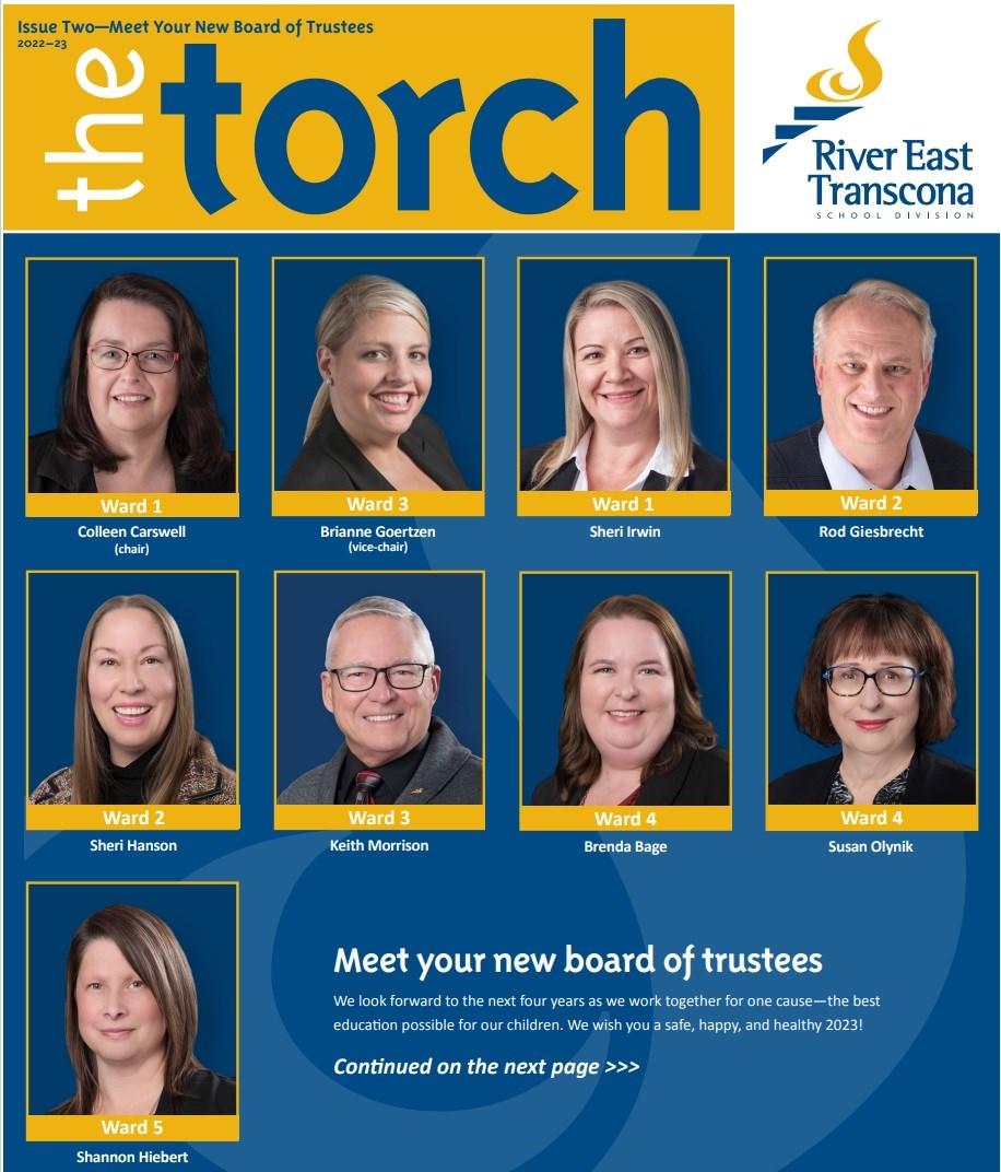 The Torch, established in 2004, is the board of trustees' newsletter and is published several times a year and delivered by Canada Post to RETSD-area homes. We welcome your feedback about The Torch. You can contact us at communications@retsd.mb.ca